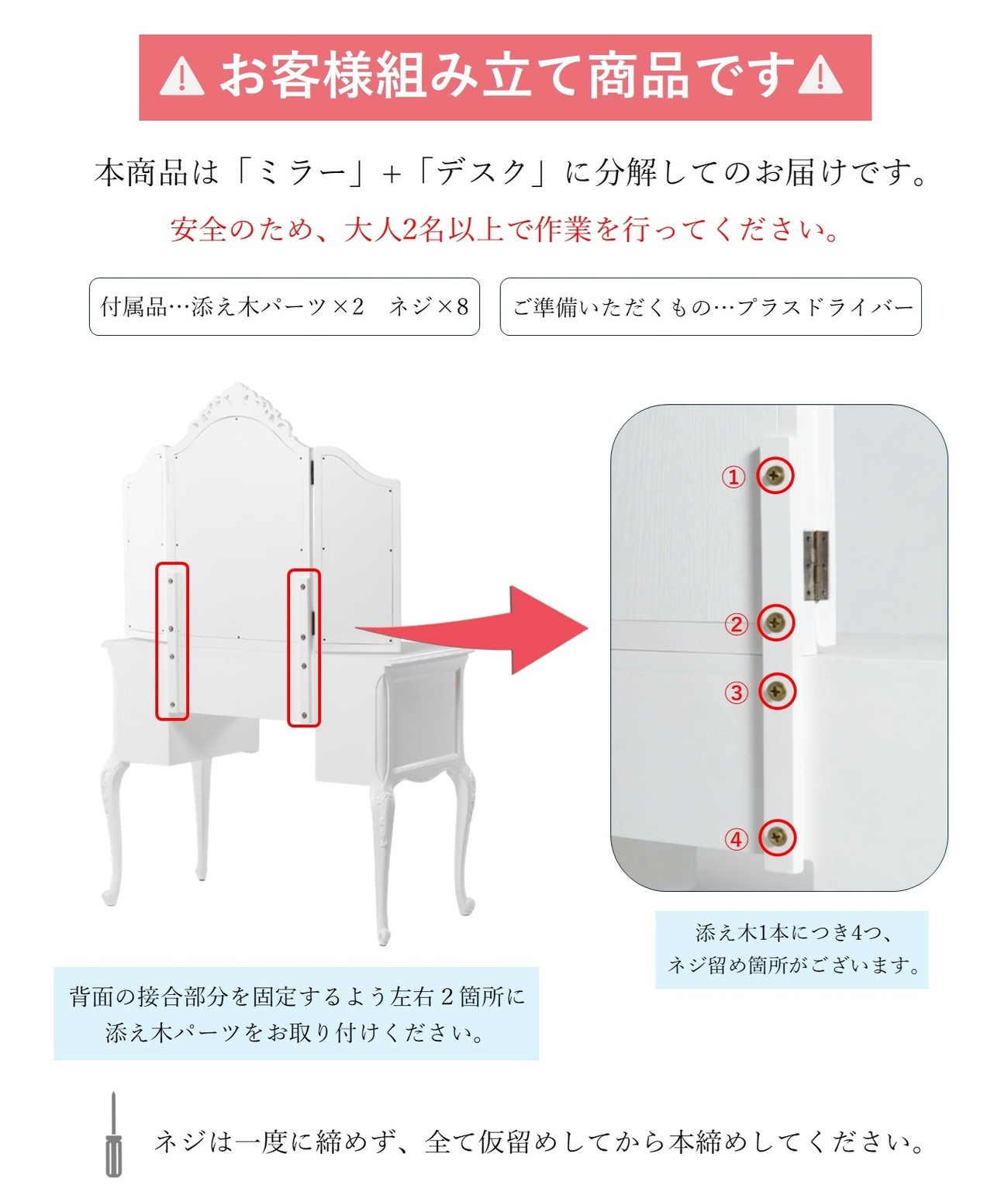 安全のため、ミラーとデスクは分けた状態でのお届けとなります。
